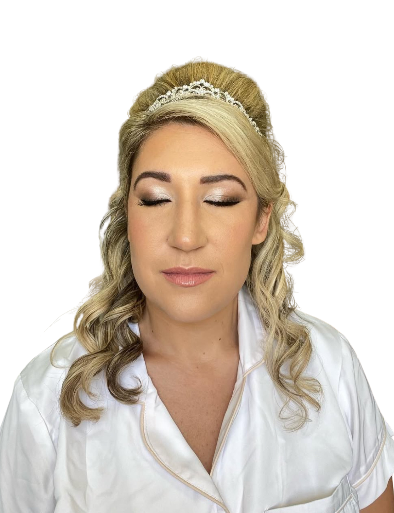 Close-up of a woman with blonde hair styled in loose curls, wearing a tiara, with her eyes closed and makeup, dressed in a silky white shirt.